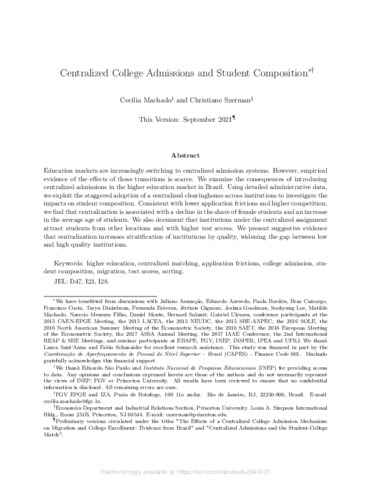Keywords: | Higher education, Centralized matching, Application frictions, College admission, Student composition, Migration, Test scores, Sorting |