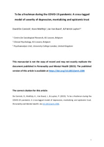 | Title: | To be a freshman during the COVID-19 pandemic: A cross-lagged model of severity of depression, mentalizing and epistemic trust |
