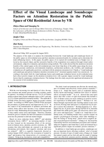 Title: | Effect of the Visual Landscape and Soundscape Factors on Attention Restoration in the Public Space of Old Residential Areas by VR |