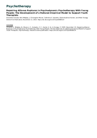| Title: | Repairing alliance ruptures in psychodynamic psychotherapy with young people: The development of a rational-empirical model to support youth therapists |