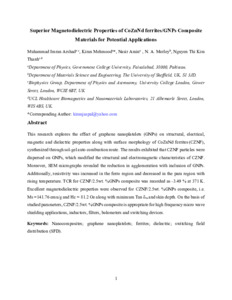 Title: | Superior magnetodielectric properties of CoZnNd ferrites/GNPs composite materials for potential applications |