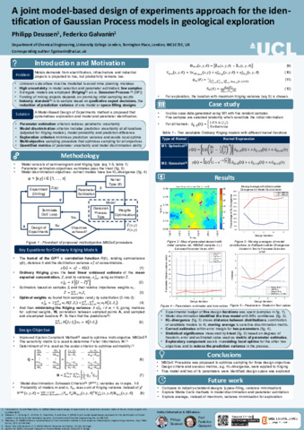When searching for potential mining sites, accurately modelling mineral concentrations or rock qualities in the subsurface is a crucial task. However, drilling in these locations is an expensive process, so reliable interpolation and efficient sampling techniques are required (Rossi & Deutsch, 2014). Gaussian Processes (GPs), also known as Kriging models, were first developed in the mining industry in the 1950s and continue to be widely used in resource modelling (Sahimi, 2011). As the true nature of the subsurface is unknown, assumptions must be made about the kernel function, which describes correlation structures between probable distributions of spatial phenomena, and its parameters must be estimated. This is typically accomplished through expert judgement and exploratory data analysis of preliminary samples. Model predictions are updated iteratively as more drilling data becomes available, with a focus on balancing expected exploitation (high grade intercepts) and exploration (minimising the Kriging variance) (Jafrasteh & Suarez, 2020). However, problems can arise if the chosen kernel is incorrect or if high uncertainty affects parameters. This poster showcases a joint model-based design approach (Galvanin et al., 2016) aiming to optimise three objectives: 1) reducing parametric uncertainty; 2) increasing the exploration of the design space to avoid local optima; 3) maximising the distinguishability of candidate model predictions to identify the most suitable kernel function with the minimum number of samples. Two different kernels in an Ordinary Kriging GP were used as candidate models and in-silico data was generated using one kernel. Starting from some initial samples, the optimal design strategy iteratively determined sampling locations to maximise the distinguishability between model predictions with a constraint ensuring that each iteration reduces prediction variance. The correct model could be distinguished and the data approximated well with a limited number of drilling experiments while satisfactorily estimating kernel parameters.