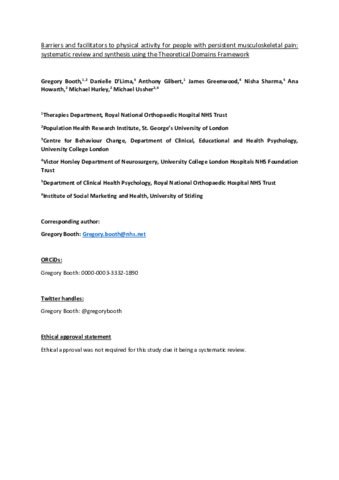| Title: | Barriers and facilitators to physical activity for people with persistent musculoskeletal pain: systematic review and synthesis using the Theoretical Domains Framework |