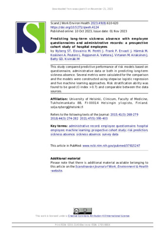 Title: | Predicting long-term sickness absence with employee questionnaires and administrative records: a prospective cohort study of hospital employees |