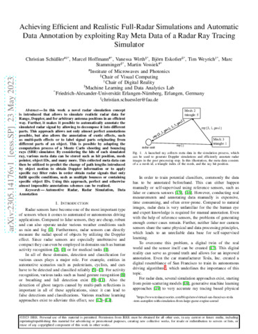 Title: | Achieving Efficient and Realistic Full-Radar Simulations and Automatic Data Annotation by Exploiting Ray Meta Data from a Radar Ray Tracing Simulator |