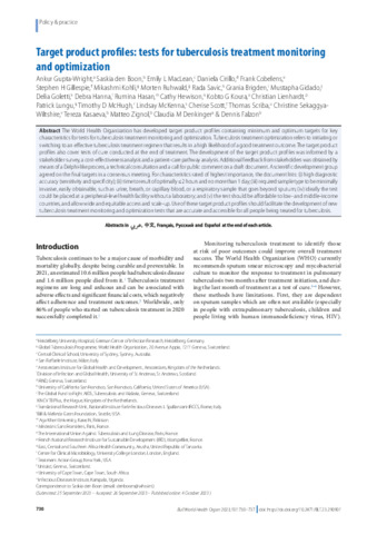 Title: | Target product profiles: tests for tuberculosis treatment monitoring and optimization |