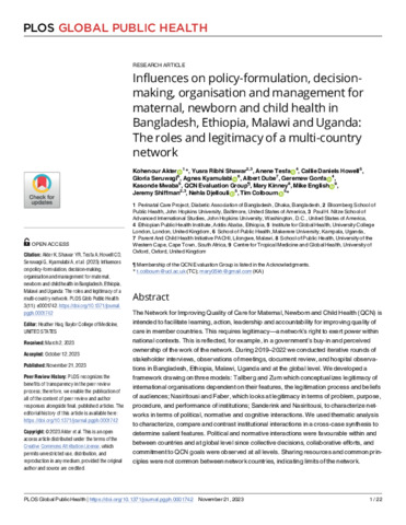 | Title: | Influences on policy-formulation, decision-making, organisation and management for maternal, newborn and child health in Bangladesh, Ethiopia, Malawi and Uganda: The roles and legitimacy of a multi-country network |