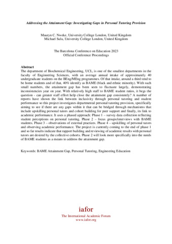The department of Biochemical Engineering, UCL, is one of the smallest departments in the faculty of Engineering Sciences, with an average annual intake of approximately 40 undergraduate students on the BEng/MEng programmes. Of that intake, around a third tend to be home students and of that, 40% identify as BAME (black and ethnic minority). With such small numbers, the attainment gap has been seen to fluctuate largely, demonstrating inconsistencies year on year. With relatively high staff to BAME student ratios, it begs the question - can greater staff effort help close the attainment gap consistently? A number of reports have shown the link between inclusivity through personal tutoring and student performance so this project investigates departmental personal tutoring provision, specifically aiming to see if there are any gaps within it that can be bridged through mechanisms that include upskilling personal tutors and cohort building for peer support and finally, its link to academic performance. It uses a phased approach: Phase 1 – survey data collection reflecting student perceptions on personal tutoring. Phase 2 – focus groups/interviews with BAME students. Phase 3 – observations of external practices. Phase 4 – upskilling of personal tutors and observing academic performance. The project is currently coming to the end of phase 1 and so far results indicate that rapport building and reviewing of academic results with personal tutors are desired by the collective cohorts. Phase 2 will look more specifically into the needs of BAME students as a means to address the attainment gap.