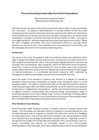 The early months and weeks of the Covid-19 pandemic saw an influx of urban households into rural areas. An apparent decentralisation of housing markets around the world prompted specific questions (how will rural areas cope and what will be the implications on the distribution of housing resources?) and broader musings (have we passed ‘peak urbanisation’ in Western countries, and what will be the function of cities – in an age of post-agglomeration?). What has happened since those early weeks and months? Taking the case of England and Wales, this short commentary reflects on housing market patterns over the last 2 years, their implications for rural places and communities, and the challenges they present to housing and planning policy.