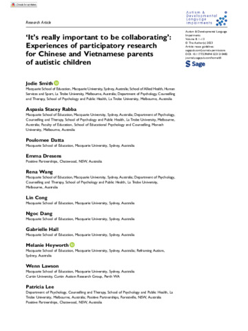 | Title: | ‘It's really important to be collaborating’: Experiences of participatory research for Chinese and Vietnamese parents of autistic children |