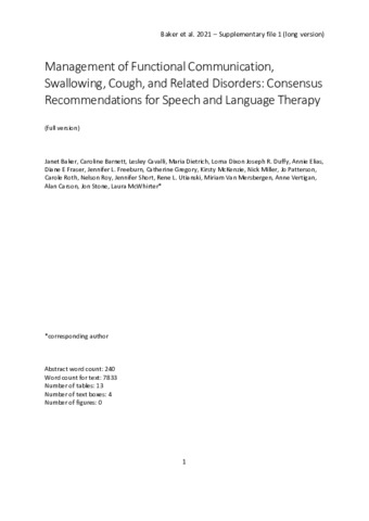 | Title: | Management of functional communication, swallowing, cough and related disorders: Consensus recommendations for speech and language therapy |