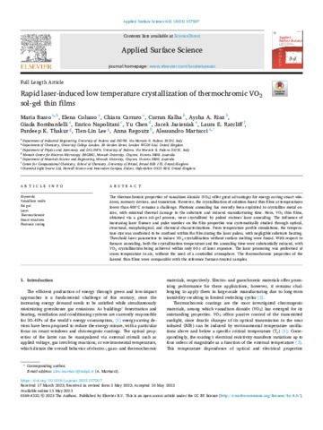 Title: | Rapid laser-induced low temperature crystallization of thermochromic VO2 sol-gel thin films |