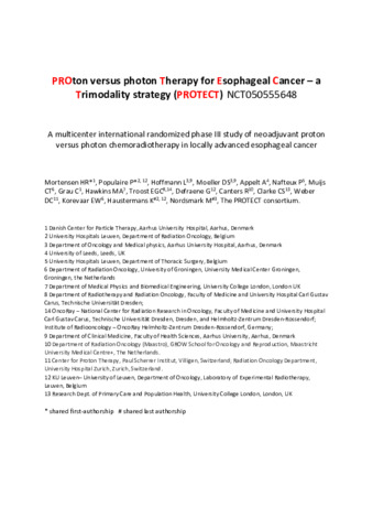 | Title: | Proton versus photon therapy for esophageal cancer – A trimodality strategy (PROTECT) NCT050555648: A multicenter international randomized phase III study of neoadjuvant proton versus photon chemoradiotherapy in locally advanced esophageal cancer |