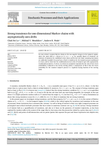 Title: | Strong transience for one-dimensional Markov chains with asymptotically zero drifts |