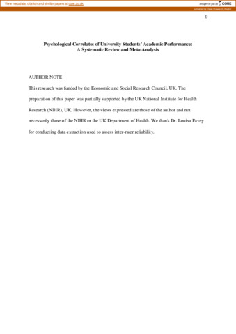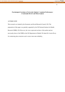 Title: | Psychological Correlates of University Students' Academic Performance: A Systematic Review and Meta-Analysis |