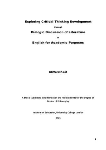 Title: | Exploring Critical Thinking Development through Dialogic Discussion of Literature in English for Academic Purposes |