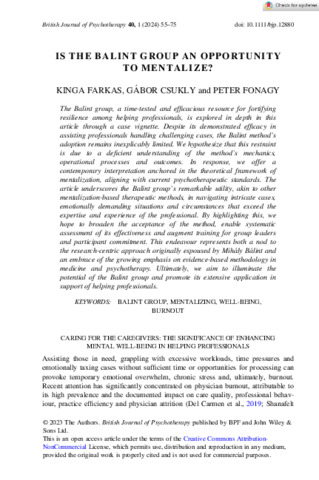 Fonagy_Brit J Psychotherapy - 2023 - Farkas - Is the Balint Group an Opportunity to Mentalize.pdf Download (362kB) | Preview |
