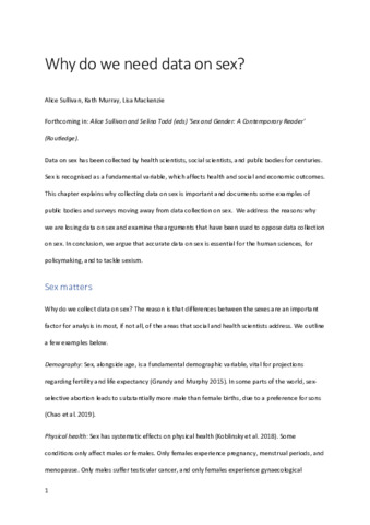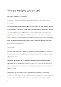 Data on sex has been collected by human scientists, social scientists, and public bodies for as long as data collection has existed. Sex is recognised as a fundamental demographic variable, which affects both health and a wide range of social and economic outcomes. Yet, in recent years, there has been pressure on public bodies to stop collecting data on sex, on the grounds that acknowledging sex denies people’s inner “gender identity”, which may clash with their sex. This chapter explores the consequences of the loss of data on sex in a number of areas, including the gender pay gap, crime and prisons, and understanding trends and outcomes for the trans population. In conclusion, the authors argue that accurate data on sex is essential for the social sciences and to tackle sexism. Finally, the authors discuss the ethical implications of failing to collect data on sex.