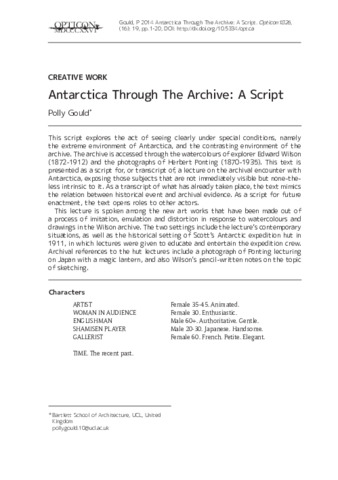 This script explores the act of seeing clearly under special conditions, namely the extreme environment of Antarctica, and the contrasting environment of the archive. The archive is accessed through the watercolours of explorer Edward Wilson (1872-1912) and the photographs of Herbert Ponting (1870-1935). This text is presented as a script for, or transcript of, a lecture on the archival encounter with Antarctica, exposing those subjects that are not immediately visible but none-theless intrinsic to it. As a transcript of what has already taken place, the text mimics the relation between historical event and archival evidence. As a script for future enactment, the text opens roles to other actors. This lecture is spoken among the new art works that have been made out of a process of imitation, emulation and distortion in response to watercolours and drawings in the Wilson archive. The two settings include the lecture’s contemporary situations, as well as the historical setting of Scott’s Antarctic expedition hut in 1911, in which lectures were given to educate and entertain the expedition crew. Archival references to the hut lectures include a photograph of Ponting lecturing on Japan with a magic lantern, and also Wilson’s pencil-written notes on the topic of sketching.