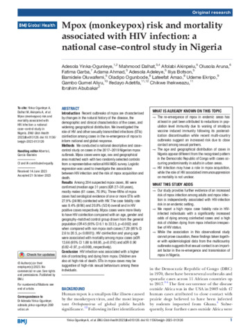 Mpox (monkeypox) risk and mortality associated with HIV infection a national case-control study in Nigeria.pdf - Other Download (287kB) | Preview |