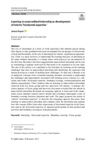 The rise of internships as a form of work experience that students pursue during their degree or after graduation has been accompanied by an upsurge of discussions, critical and favourable, on the role of internships for interns’ employment opportunities. There is a need, however, to understand the learning that goes in internship as for many students internship is a setting where work practices are encountered for the first time. Recently it has been suggested that unaccredited internship can be seen as constituting a separate work activity that needs to be examined in its own right. The aim of this article is to contribute to this literature by focusing on the learning challenges that arise in unaccredited internship and identifying the capacities that interns develop as a result of tackling these challenges. To that end, I identify a set of analytical concepts from vocational learning literature developed to understand the challenges and opportunities associated with learning across contexts (i.e. education and work): horizontal expertise, boundary-crossing, recontextualisation and identity-renegotiation. Then I analyse data on learning in unaccredited internships collected from five focus groups and two interviews (18 interns). A dialogic discourse analysis of focus group and interview discourses revealed that the interns in unaccredited internship developed an emerging capacity to learn and work competently across multiple contexts and to initiate and coordinate subsequent cycles of boundary-crossing between education and work. The paper proposes the notion of “interns’ horizontal expertise” to describe this emerging capacity that arises from learning in unaccredited internship and continues after the internship and explains how this concept differs from other expressions of horizontal expertise in the literature such as the horizontal expertise of seasoned professionals in inter-professional activities and boundary-crossing in work placements.