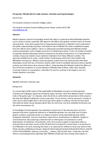 Modern genetics research increasingly reveals that what is commonly termed Mendelian genetics occurs rarely in nature, especially with regard to the effects that genetic variation exerts on human characteristics. It has been argued that an inappropriate emphasis on Mendel’s work could distort the public understanding of genetics and indeed in the UK Mendel has been completely dropped from the official school syllabus. There is a widespread misunderstanding that Mendel studied common phenotypes such as height and colour in individual pea plants. In fact, he studied a handful of specially selected phenotypes which he observed to be always dichotomous in 22 specially bred varieties of pea and studied crosses between individuals from these different varieties. This approach enabled him to study a small number of phenotypes which did in fact exhibit truly Mendelian transmission. Modern molecular genetic studies have now demonstrated that these phenotypes result from loss of function variants which result in markedly reduced activity of specific proteins and which hence have recessive effects. Understanding that Mendel studied the effects of loss of function mutations in crosses between artificially bred varieties, rather than naturally occurring variation in a population, could allow his work to continue to be taught as part of a modern genetics curriculum.