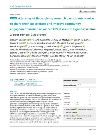 Title: | A Journey of Hope: giving research participants a voice to share their experiences and improve community engagement around advanced HIV disease in Uganda [version 2; peer review: 2 approved] |