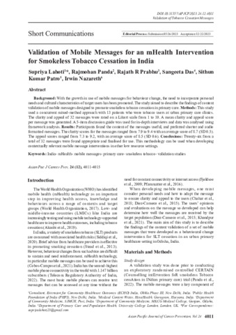Title: | Validation of Mobile Messages for an mHealth Intervention for Smokeless Tobacco Cessation in India |