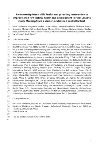 | Title: | A community-based child health and parenting intervention to improve child HIV testing, health, and development in rural Lesotho (Early Morning Star): a cluster-randomised, controlled trial |