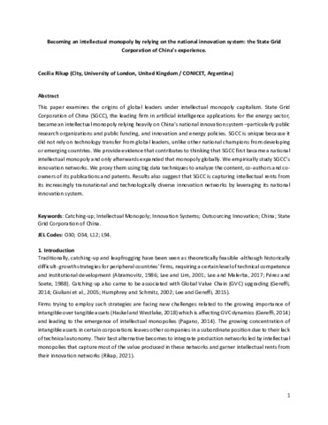 | Title: | Becoming an intellectual monopoly by relying on the national innovation system: the State Grid Corporation of China's experience |