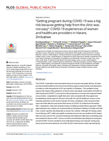 | Title: | "Getting pregnant during COVID-19 was a big risk because getting help from the clinic was not easy": COVID-19 experiences of women and healthcare providers in Harare, Zimbabwe |
