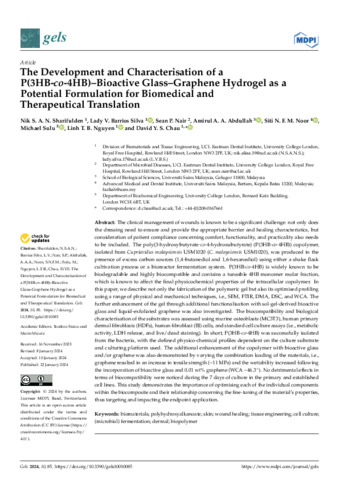 | Title: | The Development and Characterisation of a P(3HB-co-4HB)–Bioactive Glass–Graphene Hydrogel as a Potential Formulation for Biomedical and Therapeutical Translation |