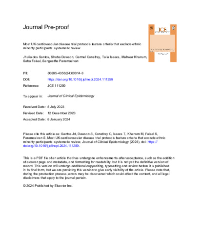 Title: | Most UK cardiovascular disease trial protocols feature criteria that exclude ethnic minority participants: systematic review |