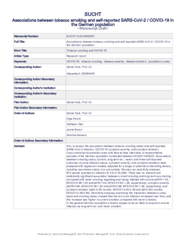 | Title: | Associations between tobacco smoking and self-reported SARS-CoV‐2 / COVID-19 in the German population |