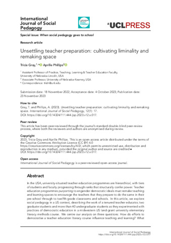 Title: | Unsettling teacher preparation: cultivating liminality and remaking space |