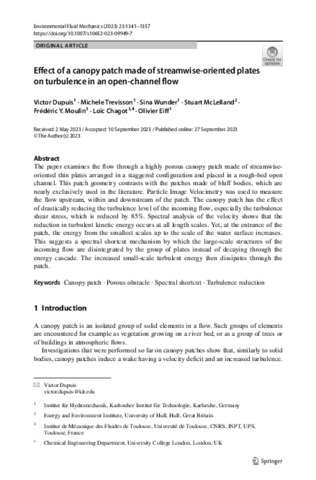 | Title: | Effect of a canopy patch made of streamwise-oriented plates on turbulence in an open-channel flow |