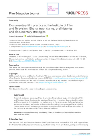 This article explores a case study of how documentary film practice is taught at the Institute of Film and Television, Ghana. Drawing on the practices of its authors – themselves documentary film-makers and former students of the institute – we explore some of the contemporary challenges facing how we approach the theory and practice of documentary film-making in contemporary Ghana, including how our students might best approach contested conceptions of the truth, and how such notions of the truth may be articulated within Ghana’s living oral traditions.
