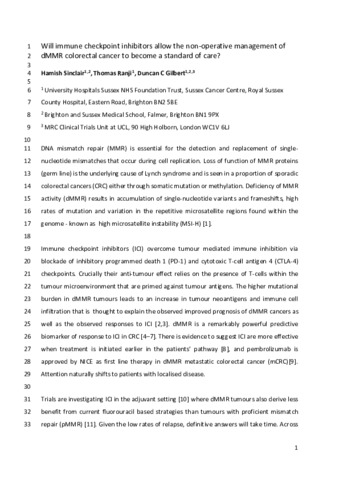 Title: | Will Immune Checkpoint Inhibitors Allow the Non-operative Management of Mismatch Repair-deficient Colorectal Cancer to Become a Standard of Care? |