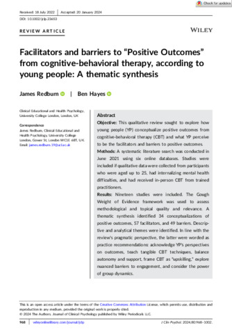 Facilitators and barriers to “Positive Outcomes” from cognitive-behavioral therapy, according to young people: A thematic synthesis.