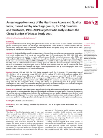 Title: | Assessing performance of the Healthcare Access and Quality Index, overall and by select age groups, for 204 countries and territories, 1990-2019: a systematic analysis from the Global Burden of Disease Study 2019 |
