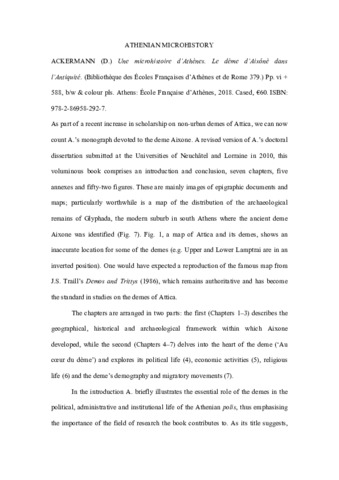 Title: | ATHENIAN MICROHISTORY - (D.) Ackermann Une microhistoire d'Athènes. Le dème d'Aixônè dans l'Antiquité. (Bibliothèque des Écoles Françaises d'Athènes et de Rome 379.) Pp. vi + 588, b/w & colour pls. Athens: École Française d'Athènes, 2018. Cased, €60. ISBN: 978-2-86958-292-7 |