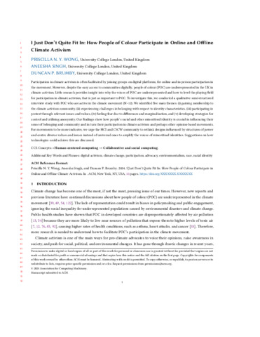 | Title: | I Just Don’t Quite Fit In: How People of Colour Participate in Online and Offline Climate Activism |