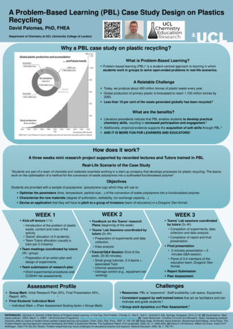 Problem-based learning (PBL) is a student-centred approach to learning in which students work in groups to solve open-ended problems in real-life scenarios. Literature precedents indicate that PBL enables students to develop practical chemistry skills, resulting in increased participation and engagement. Additionally, empirical evidence supports the acquisition of soft skills through PBL. This poster presents the design of a PBL case study in sustainable chemistry, focusing on the pressing global challenge of plastic recycling. Currently, around 400 million tonnes of plastic are produced annually, with less than 10 per cent being recycled. The case study places students in the role of chemists and materials scientists working in a start-up company dedicated to developing plastic recycling processes. Their team is tasked with optimizing a method for converting waste polystyrene into a sulfonated functionalized polymer. To support their work, students have access to recorded lectures throughout the activity. They are organized into teams and given three weeks to achieve the following objectives: optimizing the experimental method, characterizing the new functionalized materials, developing an application for the new materials, and securing funding from a group of investors. Tutors trained in PBL delivery oversee the entire activity, which is assessed through a combination of report submissions, oral presentations, and peer assessment. This PBL case study design serves as a model for laboratory-based chemistry modules where this approach is not widely utilized.