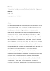Over the last decade, displacement from conflict-ridden Syria has converged with an increasing emphasis on the ‘urban-humanitarian’ nexus. Humanitarian actors have focused on urban livelihoods as refugees mainly move to cities in search of employment and a predominantly camp-based mode of assistance has turned into support for urban refugees, internally displaced people, and local urban dwellers. Within this framework, the politics of international humanitarianism has inscribed itself in cities and towns, generating layered ‘urban-itarian’ ecologies. Considering vernacular definitions of ‘urban’ and ‘urban actors’, this chapter discusses encounters and missed encounters between the urban and the humanitarian worlds. Drawing on different case-studies since 2016 in six sites across Lebanon, Türkiye, and Jordan – all primary destinations for refugees from Syria – it shows how ‘urbanising’ humanitarianism, when insufficiently responsive to local specificities, has tended to result in poorly attuned humanitarian programming. My multisite-based observations suggest that people lead hybrid lifestyles while developing complex livelihood strategies, building their worlds across the urban and the rural. In light of this, the working concept of ‘urban-itarian’ does not intend to mark those spaces as exclusively or predominantly urban; but, rather, as an interface where humanitarian and urban actors and negotiations end up marginalising or assimilating the rural and the peri-urban, regardless of environmental complexities.