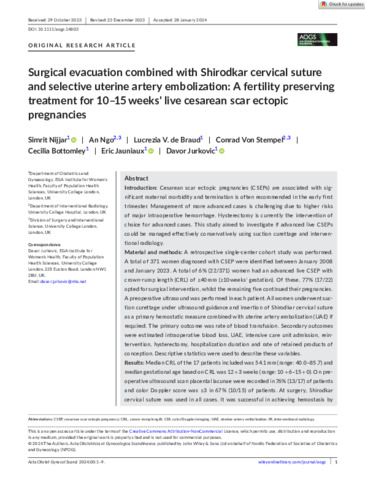 INTRODUCTION: Cesarean scar ectopic pregnancies (CSEPs) are associated with significant maternal morbidity and termination is often recommended in the early first trimester. Management of more advanced cases is challenging due to higher risks of major intraoperative hemorrhage. Hysterectomy is currently the intervention of choice for advanced cases. This study aimed to investigate if advanced live CSEPs could be managed effectively conservatively using suction curettage and interventional radiology. MATERIAL AND METHODS: A retrospective single-center cohort study was performed. A total of 371 women diagnosed with CSEP were identified between January 2008 and January 2023. A total of 6% (22/371) women had an advanced live CSEP with crown-rump length (CRL) of ≥40 mm (≥10 weeks' gestation). Of these, 77% (17/22) opted for surgical intervention, whilst the remaining five continued their pregnancies. A preoperative ultrasound was performed in each patient. All women underwent suction curettage under ultrasound guidance and insertion of Shirodkar cervical suture as a primary hemostatic measure combined with uterine artery embolization (UAE) if required. The primary outcome was rate of blood transfusion. Secondary outcomes were estimated intraoperative blood loss, UAE, intensive care unit admission, reintervention, hysterectomy, hospitalization duration and rate of retained products of conception. Descriptive statistics were used to describe these variables. RESULTS: Median CRL of the 17 patients included was 54.1 mm (range: 40.0-85.7) and median gestational age based on CRL was 12 + 3 weeks (range: 10 + 6-15 + 0). On preoperative ultrasound scan placental lacunae were recorded in 76% (13/17) of patients and color Doppler score was ≥3 in 67% (10/15) of patients. At surgery, Shirodkar cervical suture was used in all cases. It was successful in achieving hemostasis by tamponade in 76% (13/17) of patients. In the remaining 24% (4/17) patients tamponade failed to achieve complete hemostasis and UAE was performed to stop persistent arterial bleeding into the uterine cavity. Median intraoperative blood loss was 800 mL (range: 250-2500) and 41% (7/17) women lost >1000 mL. 35% (6/17) needed blood transfusion. No women required hysterectomy. CONCLUSIONS: Surgical evacuation with Shirodkar cervical suture and selective UAE is an effective treatment for advanced live CSEPs.