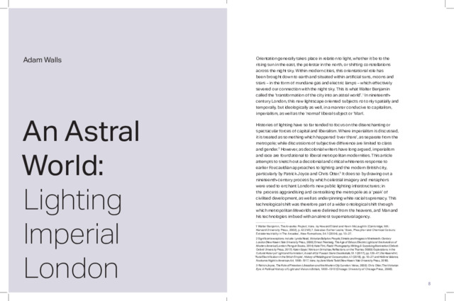 Orientation generally takes place in relation to light, whether it be to the rising sun in the east, the polestar in the north, or shifting constellations across the night sky. Within modern cities, this orientational role has been brought down to earth and situated within artificial suns, moons and stars – in the form of mundane gas and electric lamps – which effectively severed our connection with the night sky. This is what Walter Benjamin called the ‘transformation of the city into an astral world’. 1 In nineteenthcentury London, this new lightscape oriented subjects not only spatially and temporally, but ideologically as well, in a manner conducive to capitalism, imperialism, as well as the ‘normal’ liberal subject or ‘Man’.