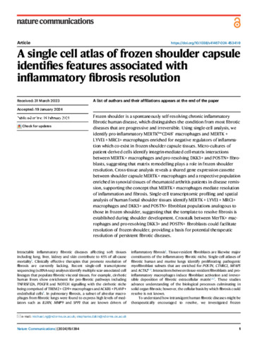 Title: | A single cell atlas of frozen shoulder capsule identifies features associated with inflammatory fibrosis resolution |