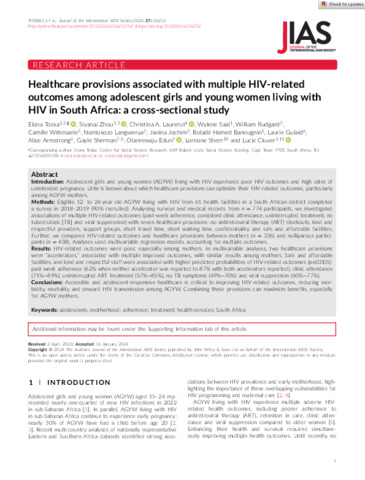 Title: | Healthcare provisions associated with multiple HIV-related outcomes among adolescent girls and young women living with HIV in South Africa: a cross-sectional study |