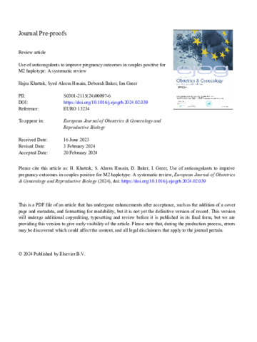 | Title: | Use of anticoagulants to improve pregnancy outcomes in couples positive for M2 haplotype: A systematic review |