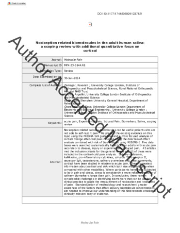 | Title: | Nociception related biomolecules in the adult human saliva: a scoping review with additional quantitative focus on cortisol |